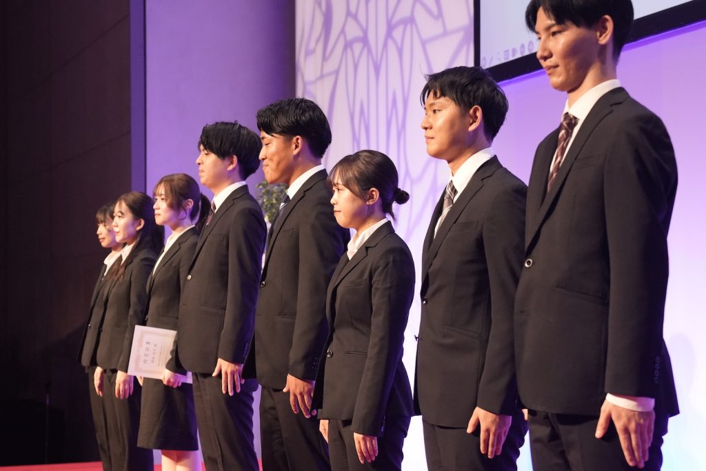 内定者代表挨拶では、8名を代表して碓氷さんが発表。就活を振り返り、この日を迎えた率直な思いや、入社後の展望を伝えてくれたフレッシュで一生懸命なスピーチに、会場からは大きな歓声と共に期待を込めた拍手が贈られました。