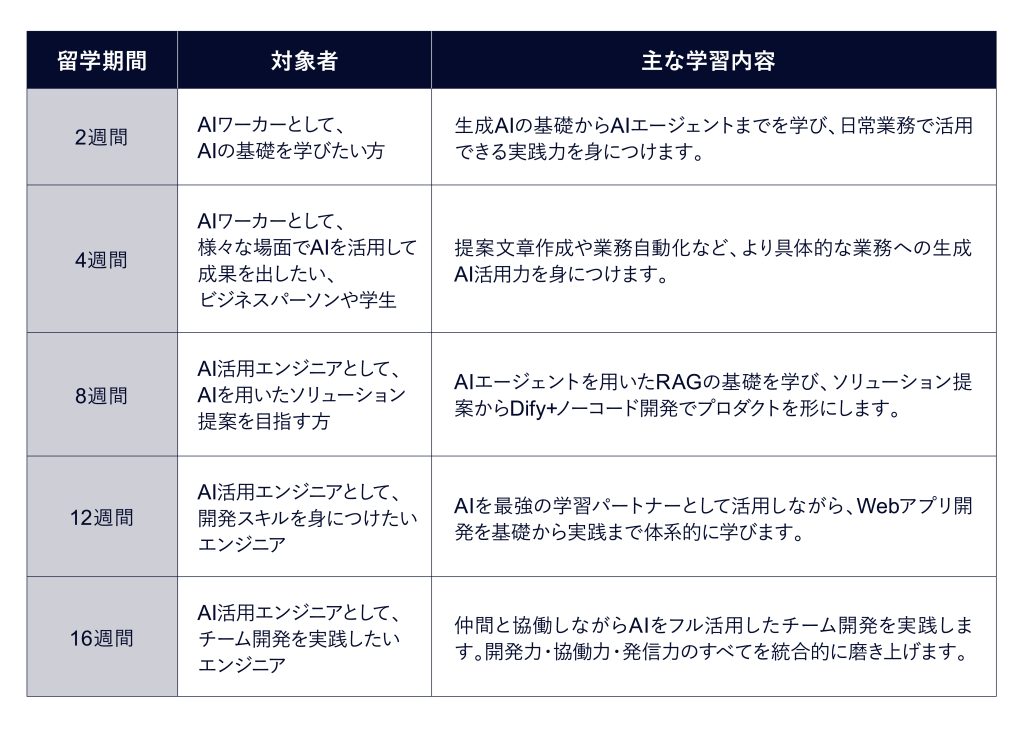デジタル留学は、個人の目的とスキルレベルに応じて、AI活用の基礎学習を目的とした2週間コースから、AIをフル活用しチーム開発を実践するエンジニア向けの16週間コースまで、5つの留学期間で構成されています。これにより、ライトにAIの基礎を学びたい方から、専門的なAI開発スキルを目指すエンジニアの方まで、「すべての人」のレベルと目的に応じて、AI時代をリードするスキル習得をサポートします。
