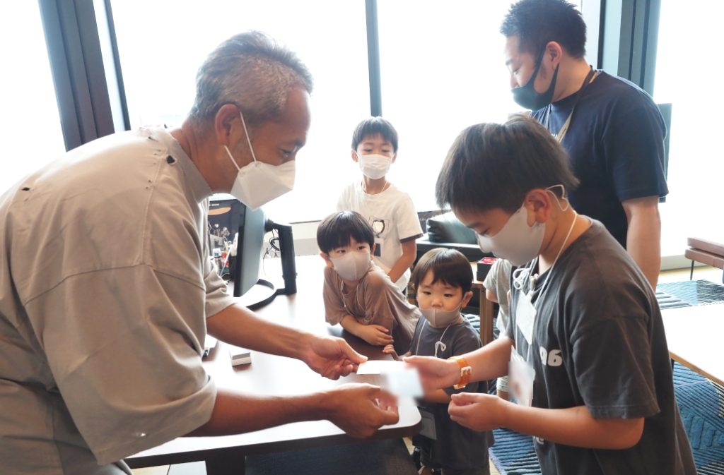 名刺を差し出すかわいらしいお子さんたちの姿に、曽根原も桜井も笑顔に。
