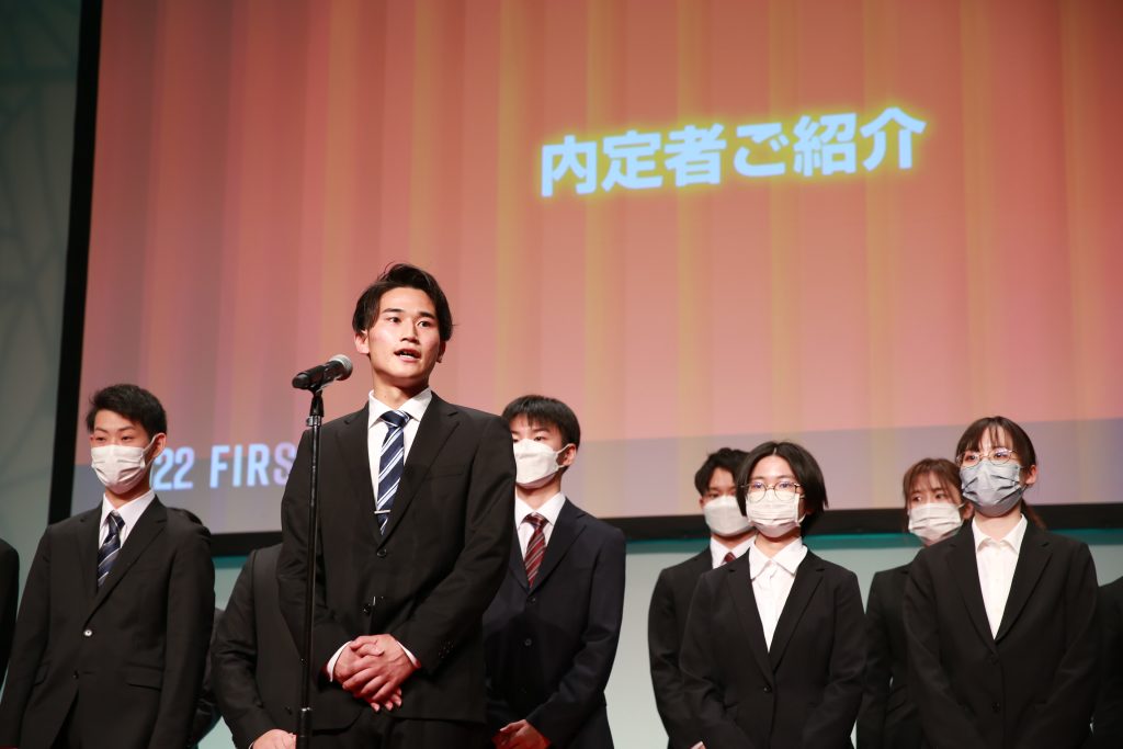 内定者代表挨拶では、ギークスグループを代表して、IT人材事業本部から内定を得たMiyazakiがスピーチ。緊張感がありつつも、堂々とした挨拶に会場全体が聴き入ります。