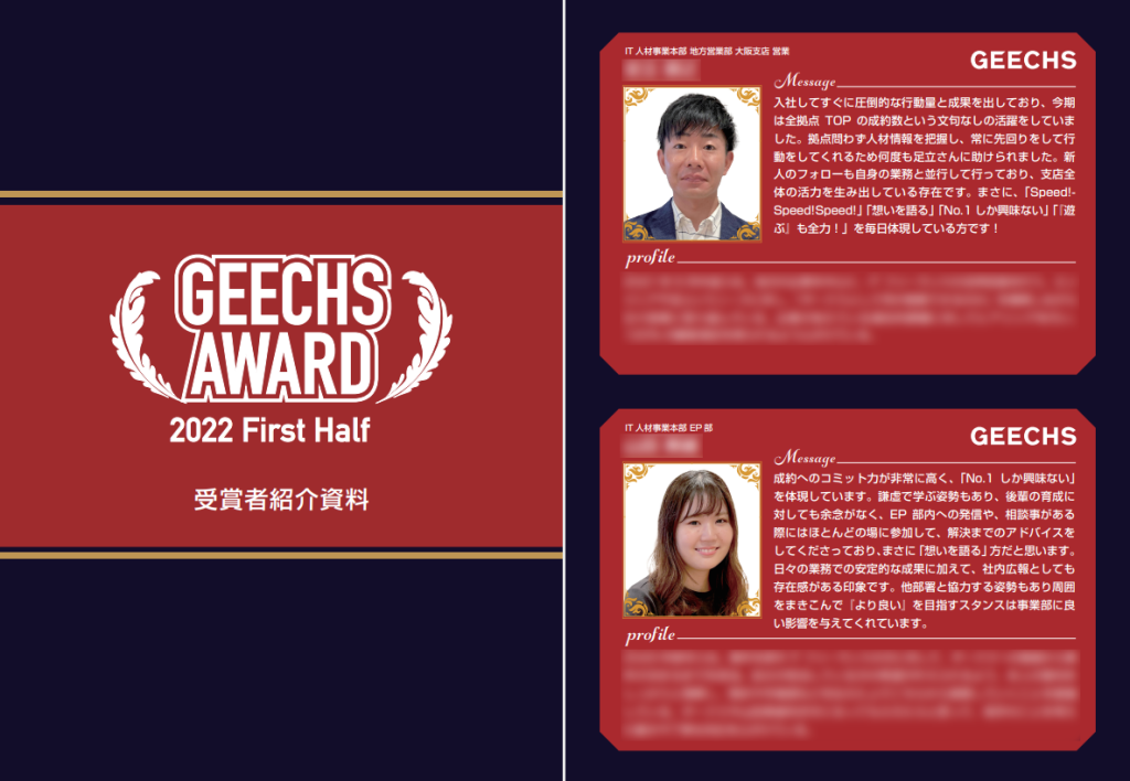 これまではギークスグループのメンバー全員が参加する全社イベントとして実施していた「全体会議」を、この2022年度上期より、Buddy賞・プロジェクト賞受賞者を讃える「授賞式」としてリニューアルし、「ギークスアワード」へと名称変更しました。