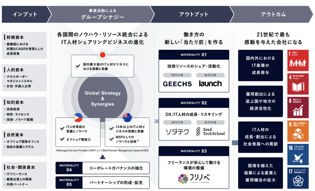 ギークスでは2023年5月に発表した「CSRレポート2023」において、私たちの事業活動と社会貢献性の連携を可視化した「GEECHS Social Impact Flow」を公開しました。