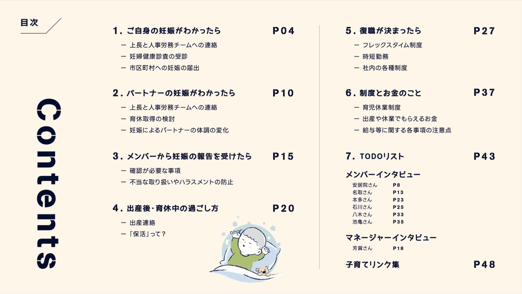 ー「産休育休ガイドブック」の目次を見ると、ご自身が妊娠したケース、パートナーが妊娠したケース、メンバーが妊娠したケースなど、様々なケースが想定されています。また、7名のメンバーのインタビュー記事などがあり、ボリューム満載の内容となっています。