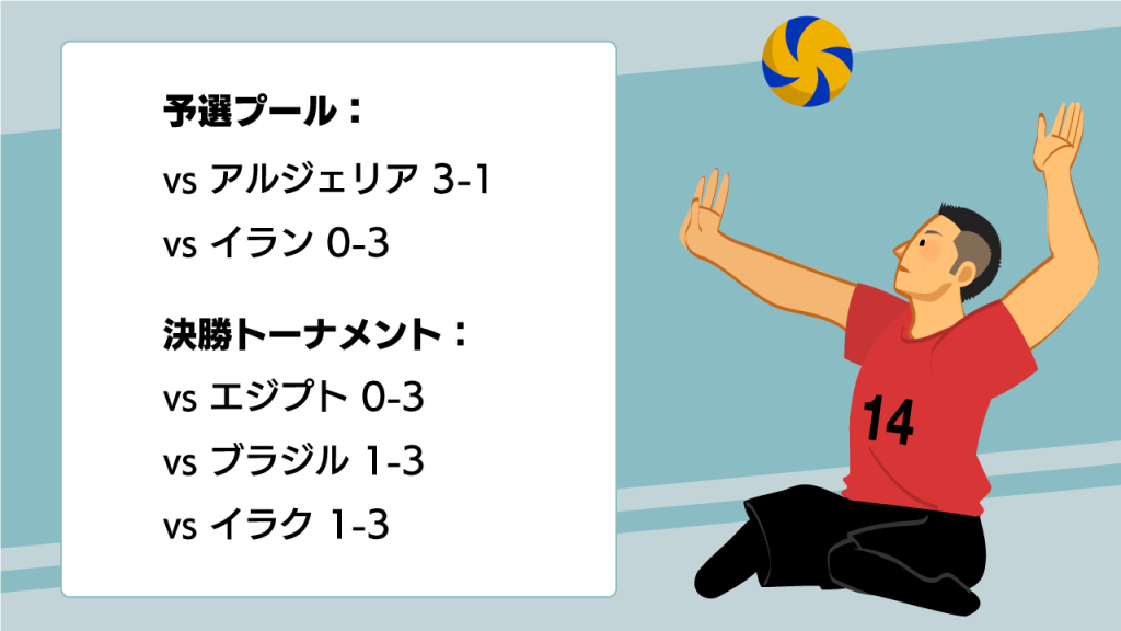 同じ予選プールに絶対王者であるイランが入っていたことも相まって「1勝すれば」という状況だったのですが、続くイランとの試合では「初めて1セットに20点を取った」という結果を収めることができ(1ケタしか取れないことも普通)、チーム力が上がったことを感じた予選の戦いでした。