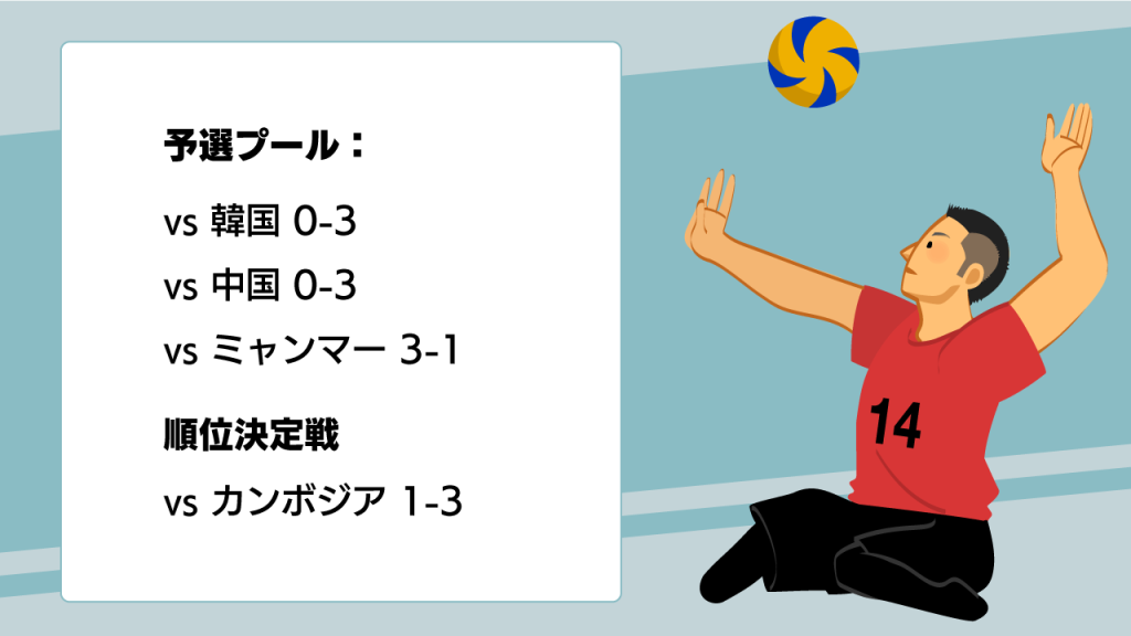 結果としては悔しい限りのアジア6位。初戦の韓国戦に勝てば決勝トーナメント、負ければ順位決定戦という大一番に負けたことが響きました(中国は格上なので)。