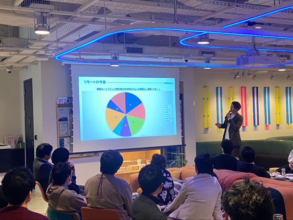 福岡で行われた「市場感トーーーーク」は、地方創生の取り組みに力を入れている地方営業部の新井が、地方と首都圏での案件の比較や地方のIT人材不足、今後日本に定着するであろう働き方などを解説。「地方×フルリモートの今後の展望について聞くことができ、参考になった」「説明がわかりやすく、市場動向を知ることができる機会になった」という声が集まりました。