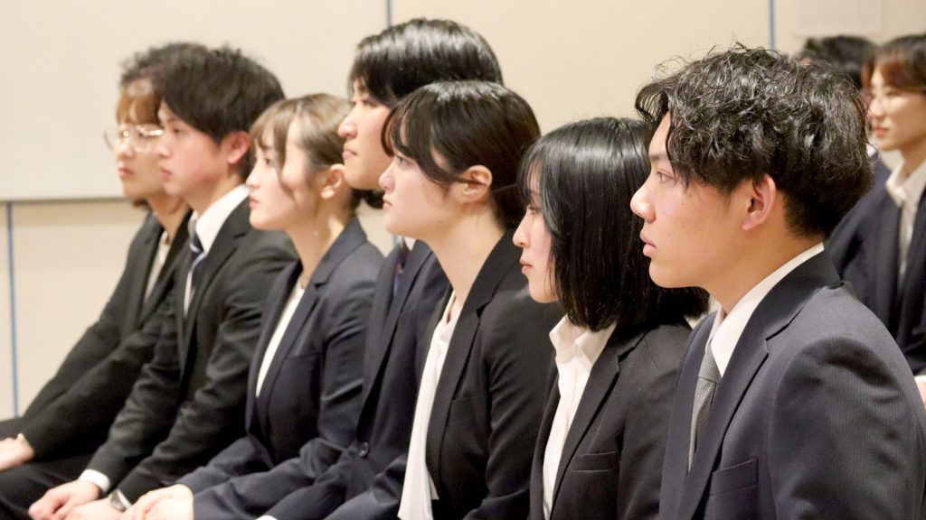 成末や曽根原のメッセージを心に刻むように真剣に聞き入る新入社員たち。