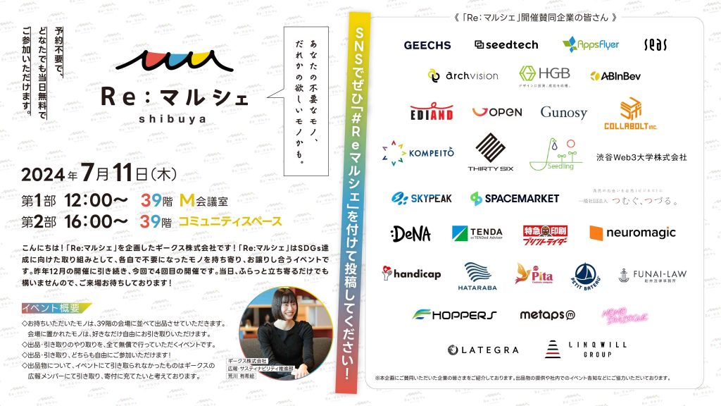 「Re:マルシェ」はギークスの広報・サスティナビリティ推進部が中心となって企画・運営するイベント。少しでも多くの方にこのイベントを知ってもらいたい、参加してもらいたいという想いから、前回に引き続き、「企画賛同企業」を募りました(前回は「開催賛同企業」という名前でした)。