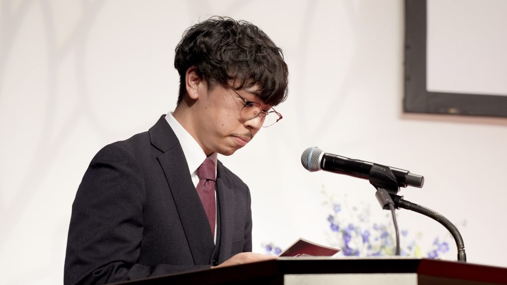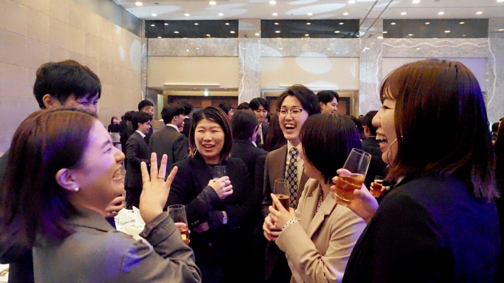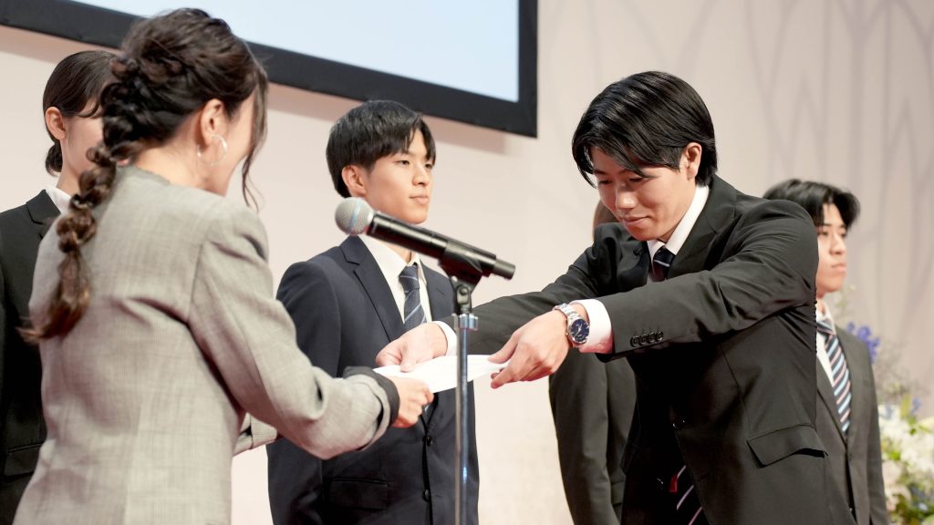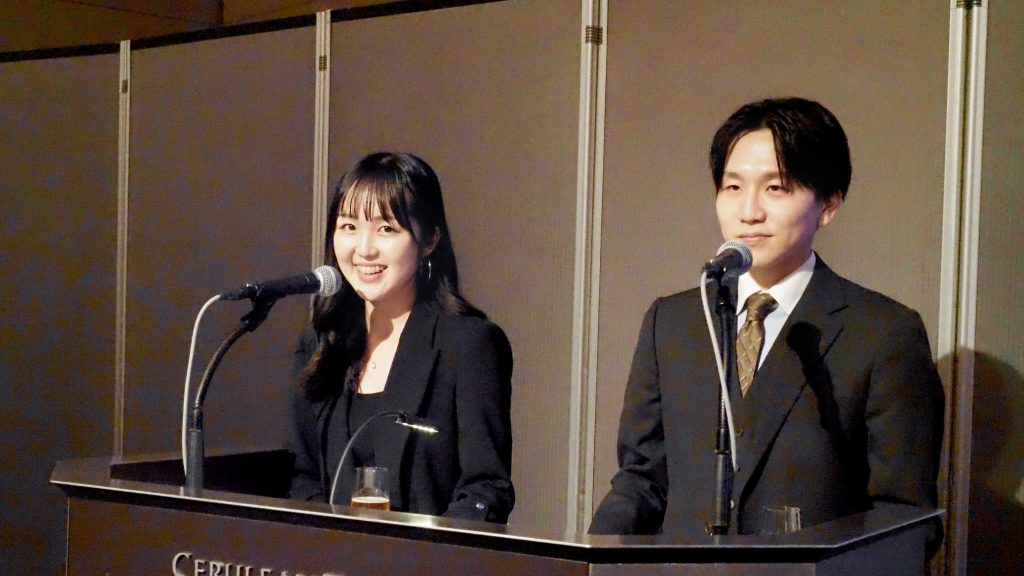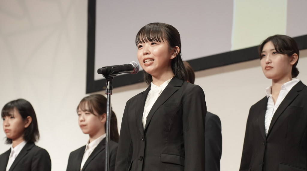 内定者代表挨拶は、11名を代表して柏木さんが発表。就活を振り返り、この日を迎えた率直な思いや、入社後の展望を一生懸命に伝えてくれたフレッシュな姿と、緊張を感じさせないほどの完璧なスピーチに、会場からは大きな歓声と共に期待を込めた拍手が贈られました。