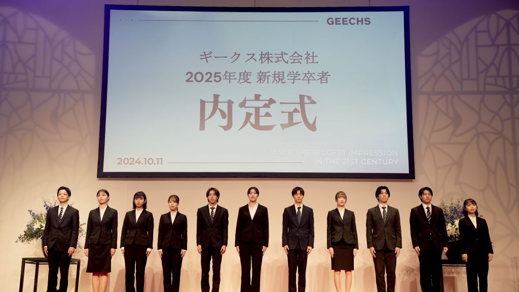 歓談の後は、2025年度新規学卒者内定式です。2025年度の内定者は、ギークスの前身の会社時代を含めると、新卒採用20年目という大きな節目の代になります。