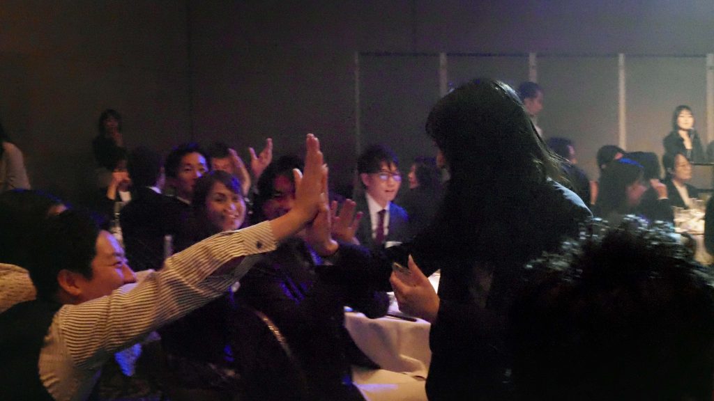 ▲水鳥さんの受賞を喜ぶメンバーとハイタッチ