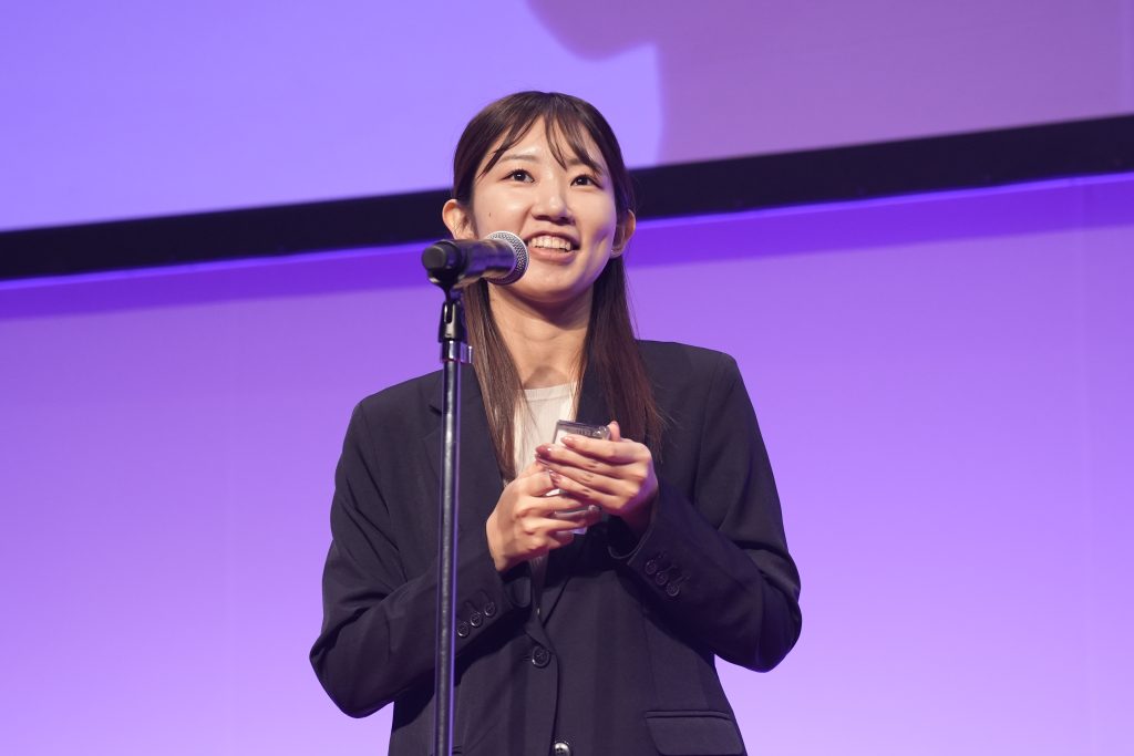 プレゼンターのIT人材事業本部の小川さんが「経営管理本部の…」と読み上げたのが聞こえた瞬間は、頭の中に「ん?」とハテナが浮かびました。そして、自分の名前が呼ばれたときには驚きで頭が真っ白になってしまって、「え?私?」「スピーチ考えてない…」「家族に報告しなきゃ」と混乱していました(笑)。