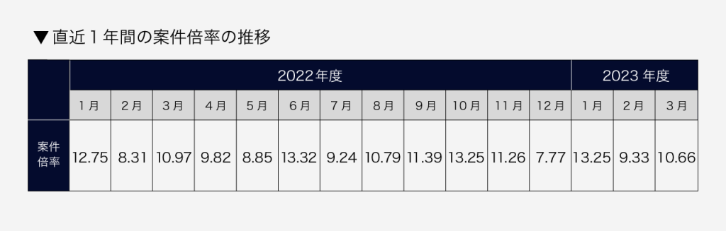 2023年1月から3月の案件倍率は、1月:13.25倍、2月:9.33倍、3月:10.66倍と高水準で推移し、四半期累計では10.83倍となりました。これにより、IT人材の確保は依然として困難な状況が続いています。