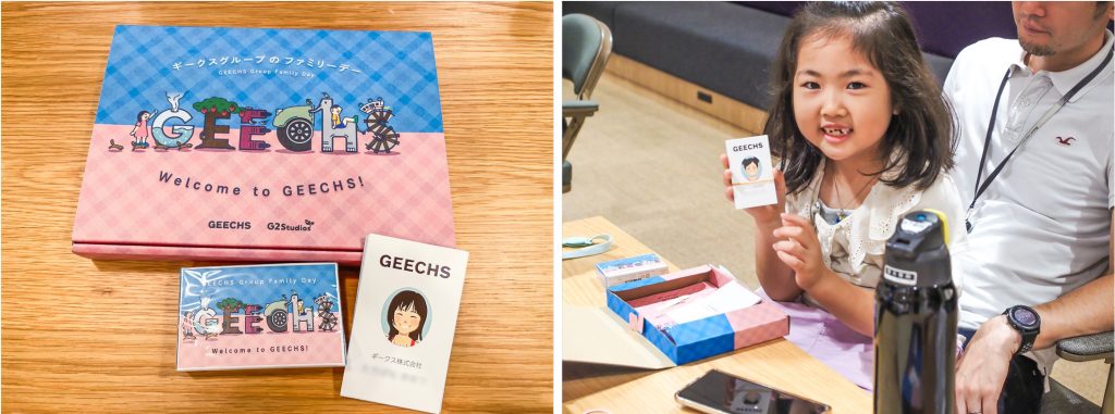 ギークスは「21世紀で最も感動を与えた会社になる」というグランドビジョンのもと、ファミリーデーを企画しました。似顔絵入りの名刺やお菓子が入ったオリジナルパッケージのギフトボックスには、「歓迎の気持ちを、参加者の期待を超えるような形で届けたい」という想いを詰め込みました。
