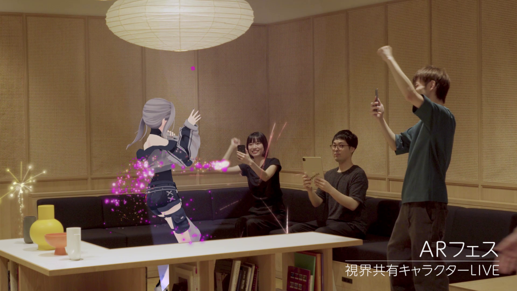 ARやMRで視界を共有し、表示されたキャラクターのLIVEを複数人で楽しむことができます。LIVE中はリズムゲームを楽しんだり、各視聴者のアクションに対して反応したりと、インタラクティブなコンテンツの提供を目指しています。