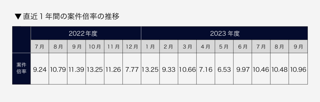 2023年7月から9月の案件倍率は、7月:10.46倍、8月:10.48倍、9月:10.96倍と推移し、四半期累計では10.65倍となりました。IT人材の確保は依然として難しい状況が続いています。