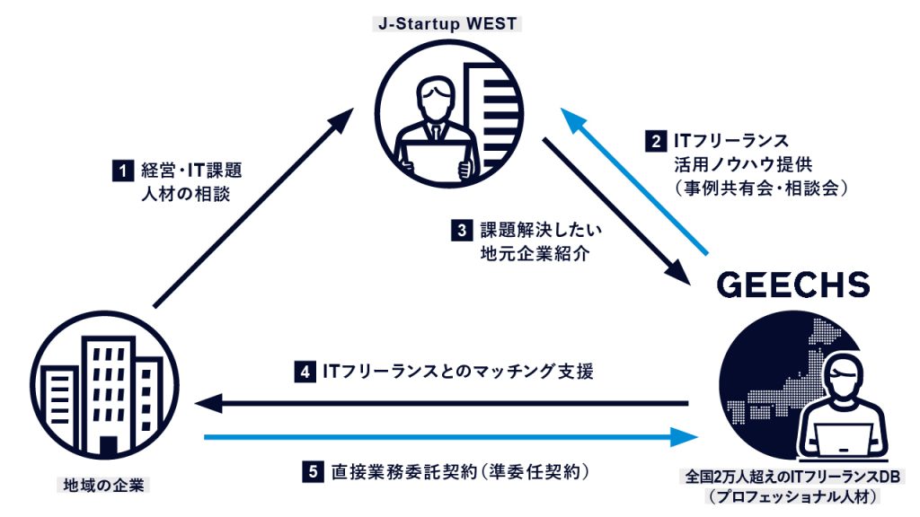 ギークスは「J-Startup WEST」の地域サポーターズの一員として、下の図のように、地元企業とITフリーランスの方々をマッチングしております。