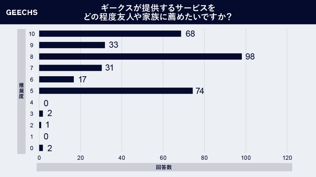 数値結果は、推薦者(10~9):30.98%、中立者(8~7):39.57%、批判者(6~0):29.45%という構成により、NPSスコアは2ポイント。前年度と比較し、+4ポイント上昇となりました。ギークスのサービスについて以下のような結果が得られました。