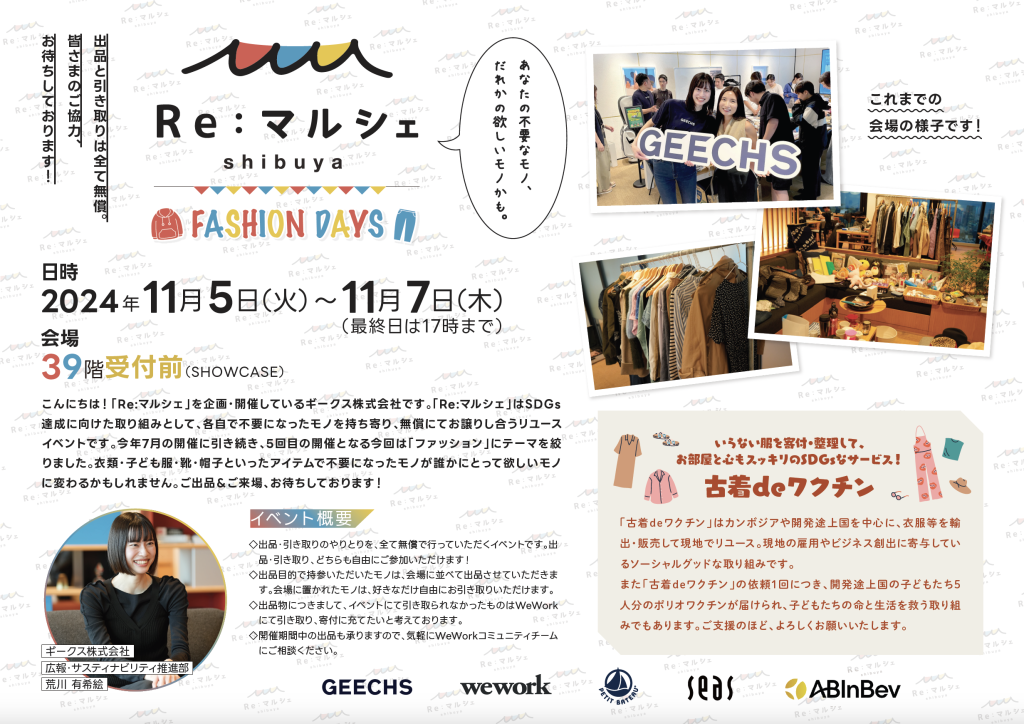 ギークス株式会社は、11月5日(火)から3日間、WeWork渋谷スクランブルスクエアにて、SDGs達成に向けたリユースイベント「Re:マルシェ FASHION DAYS」を開催したことをお知らせいたします。