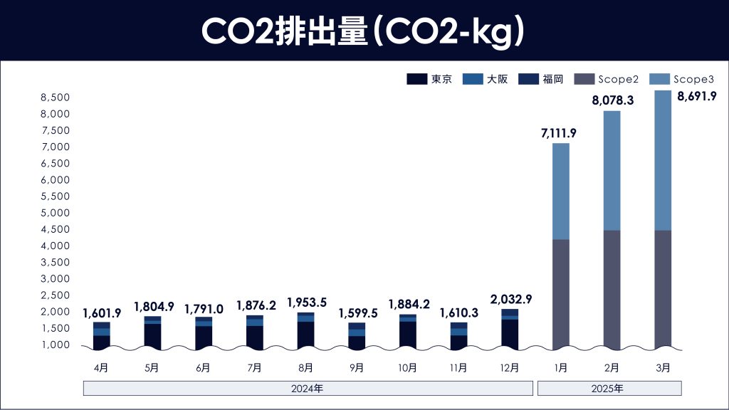 CO2排出量は、2024年12月まではScope2のみを対象とし、主に国内3拠点(東京本社:WeWork 渋谷スクランブルスクエア、大阪:WeWork LINKS UMEDA、福岡:WeWork大名)の総面積における、ギークスグループが利用する占有面積の比率から算定し、開示してきました。2025年1月からはフィリピン・セブ島オフィスの算定を開始し、また、Scope3領域(出張・通勤・リース機器)の算定および開示も実施しております。