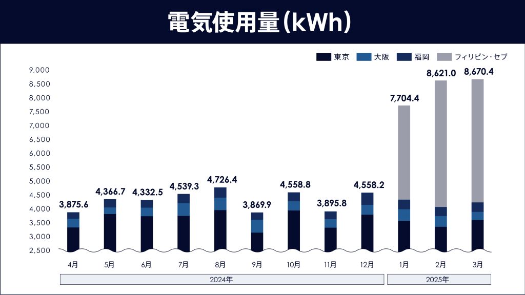 電気使用量は、当社グループの国内拠点がフレキシブルオフィスやシェアオフィスを利用していることもあり、それぞれの拠点の総面積における、ギークスグループが利用する占有面積の比率を割り出し、算定しております。2025年1月からはフィリピン・セブ島オフィスの算定を開始しました。今後はグループ各社の国内・国外拠点それぞれの電気使用量を算定し、CO2排出量のScope2開示へ連携していきます。